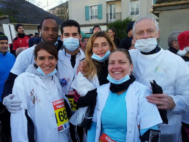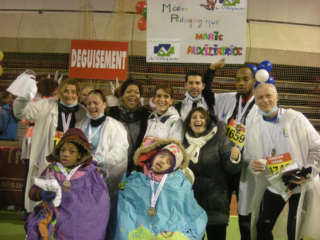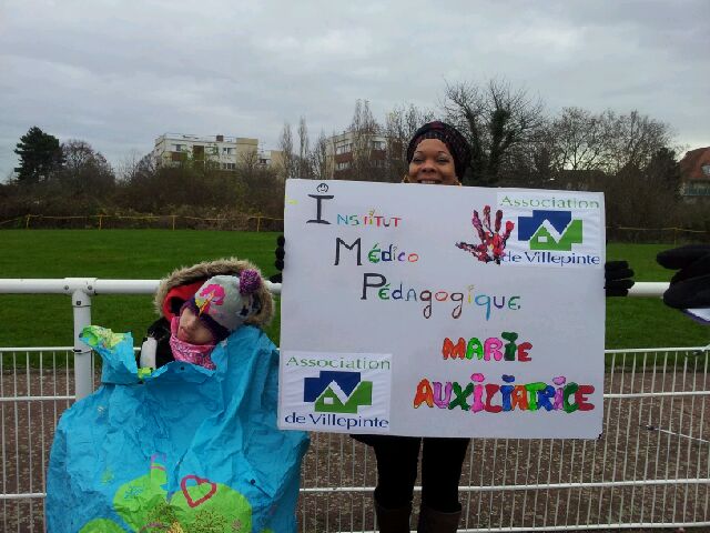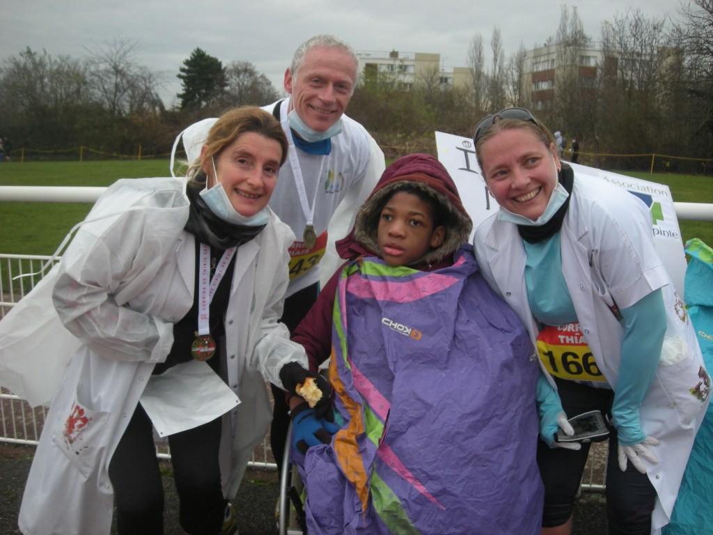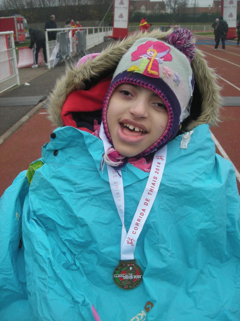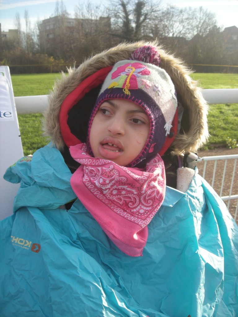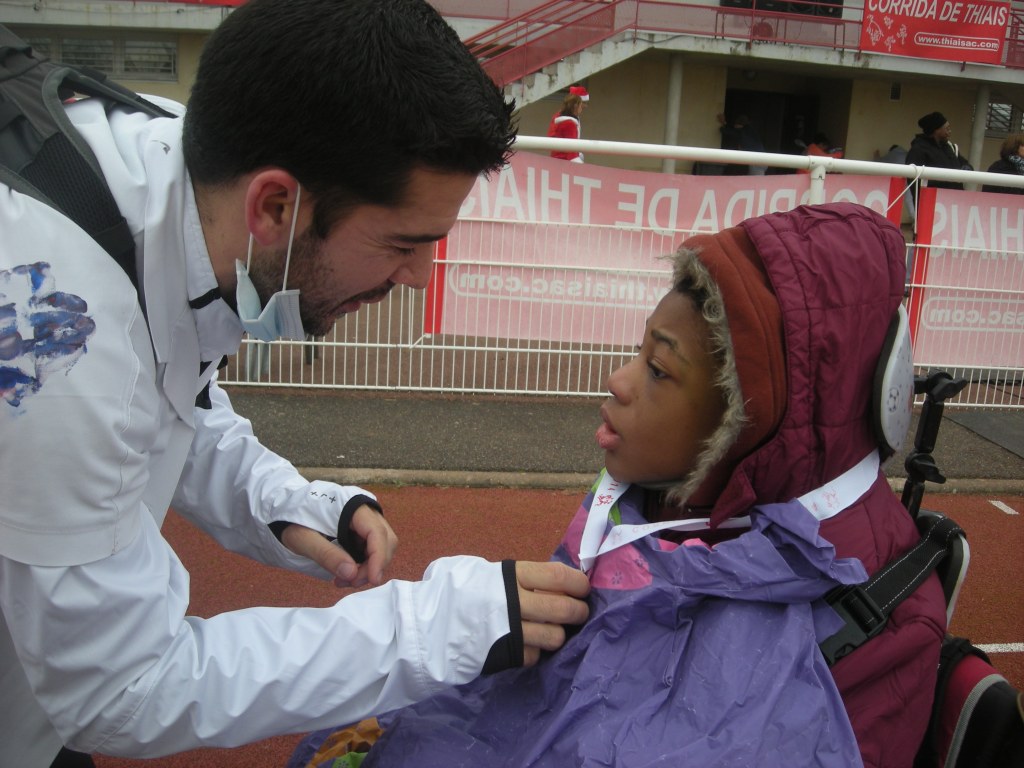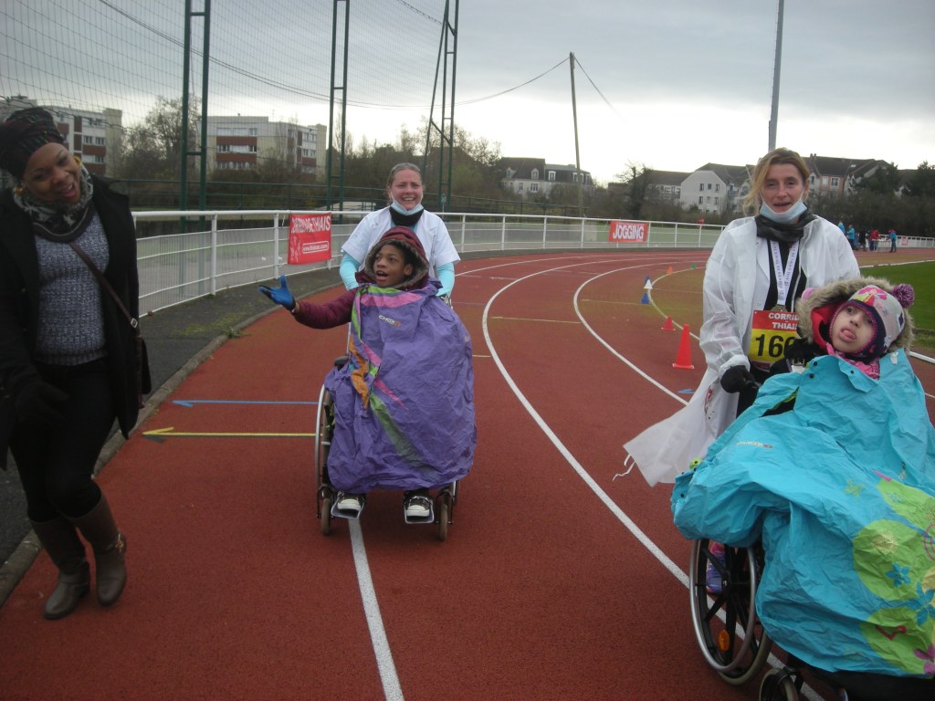 7 décembre 2014, 1ère sortie running du projet « Courir ensemble à l’IMP Marie Auxiliatrice », ce n’était pas tout à fait le terme exact mais c’était l’esprit. Direction la Corrida de Thiais, on commence à vouloir essayer de faire prendre l’air à nos protégés avec les moyens du bord. N’étant pas équipé de matériel sportif adéquat, nous nous contenterons de faire le tour du stade, qui correspond à l’arrivée de la course, avec les fauteuils roulants pour le plus grand plaisir de nos 2 stars qui, malgré le froid, garderont de belles images en tête. Quant à nous, nous n’avons plus qu’à programmer la suite parce que ……. C’ÉTAIT TROP BIEN !!!!! .
