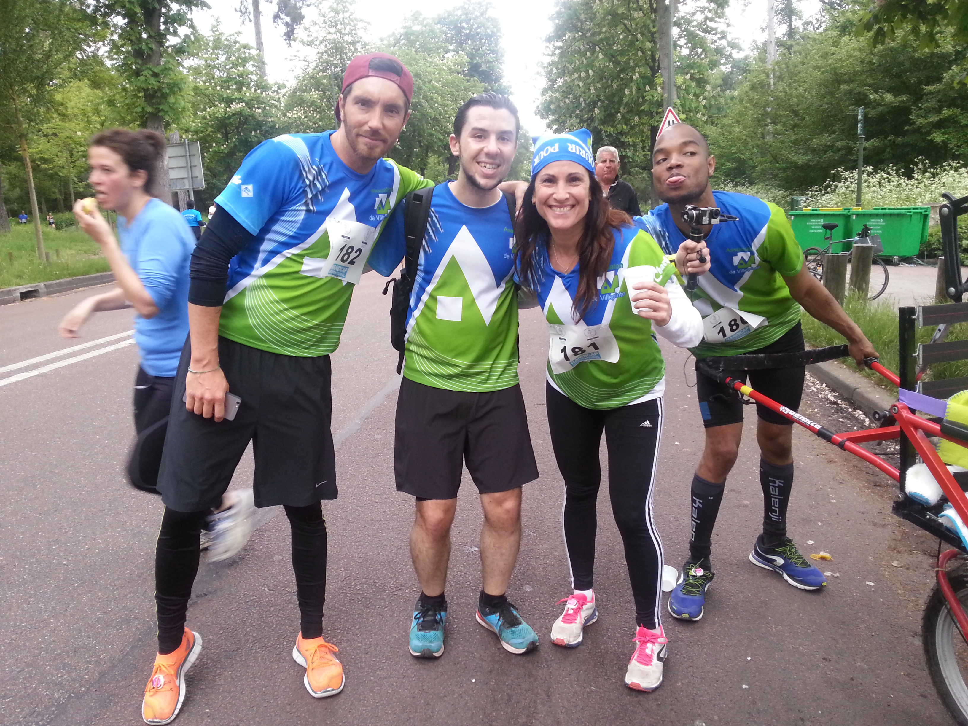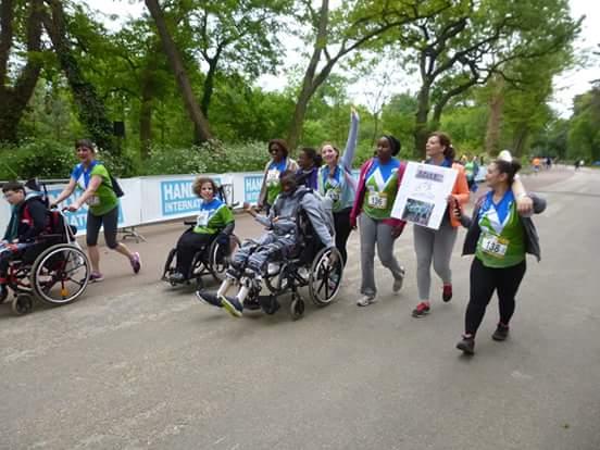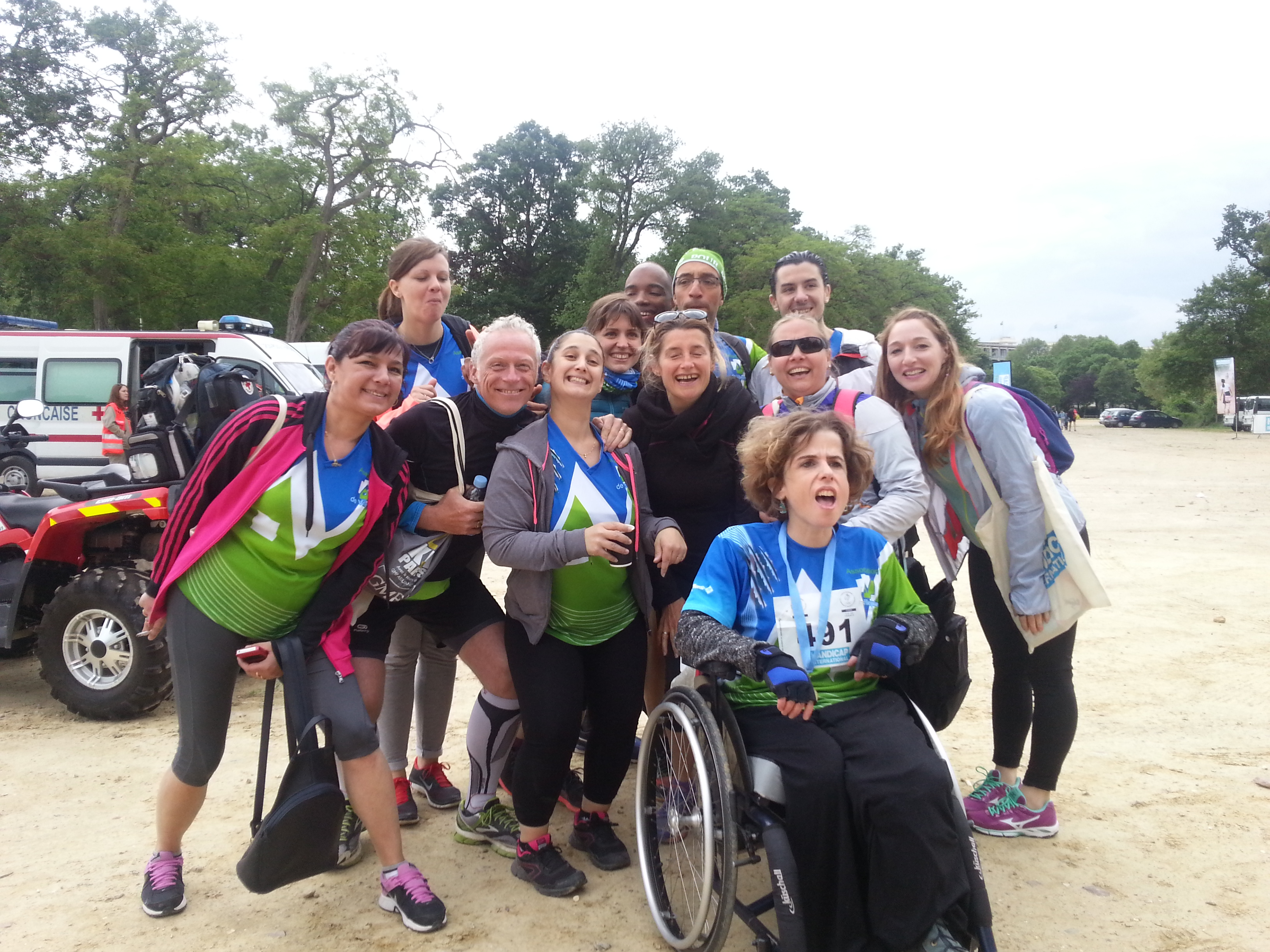 Super organisation de Handicap International pour son édition « Courir ensemble » le 15 mai, au Bois de Boulogne. Nous ne manquerons toutefois pas de signer ce départ d’un « à l’arrache » qui deviendra notre marque de fabrique. Nous discutons avec tout le monde, nous répondons aux questions et nous en oublions l’horaire du départ. Normalement les joelettes partent avant les bipèdes, nous partirons juste juste avant les coureurs, sauf moi, qui partira après tout le monde sans mon dossard (évidemment, car c’est Denis qui l’a) vraiment à l’arrache, devant courir à plus de 14 km/h pour rattraper tout le monde.
