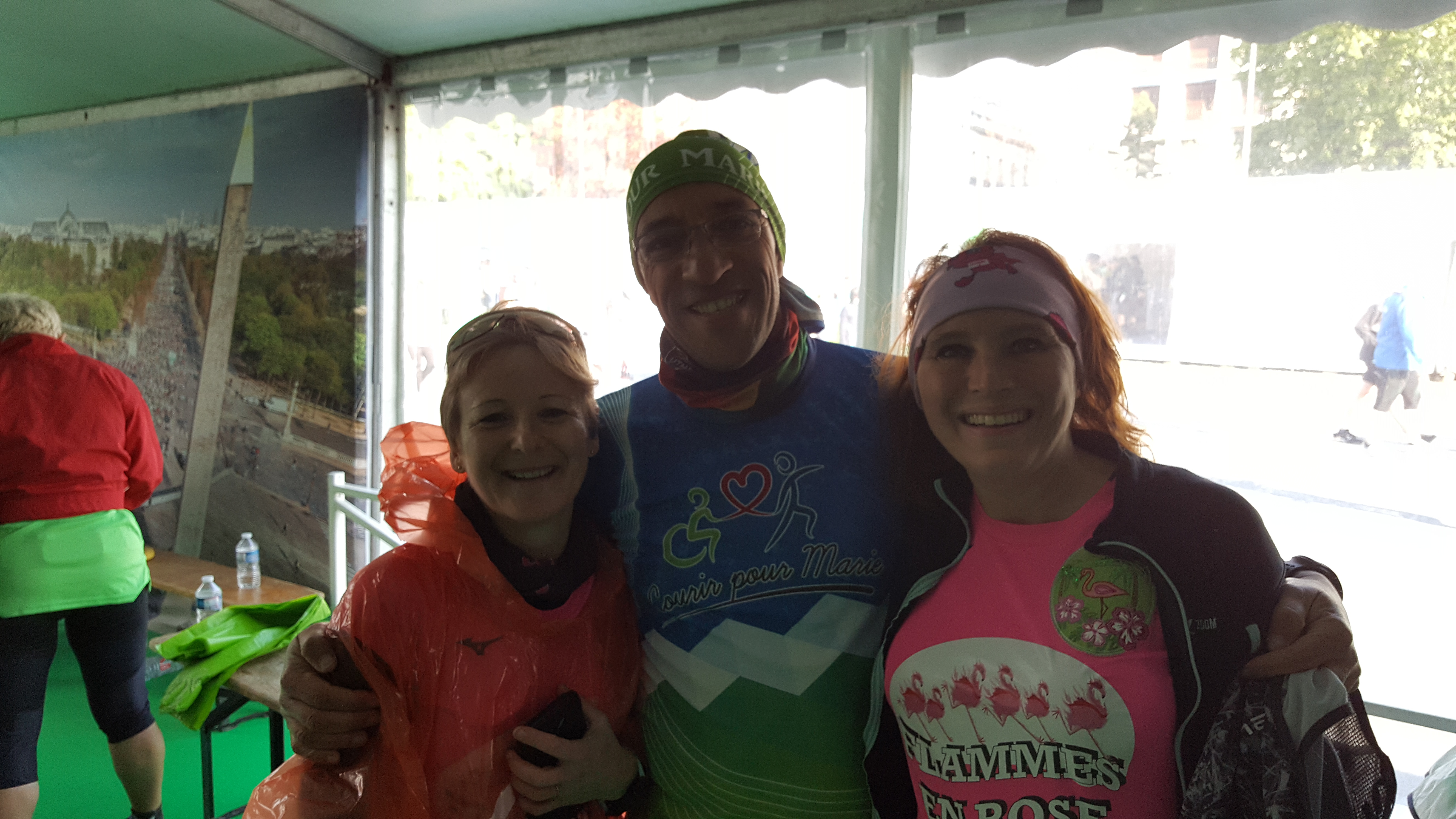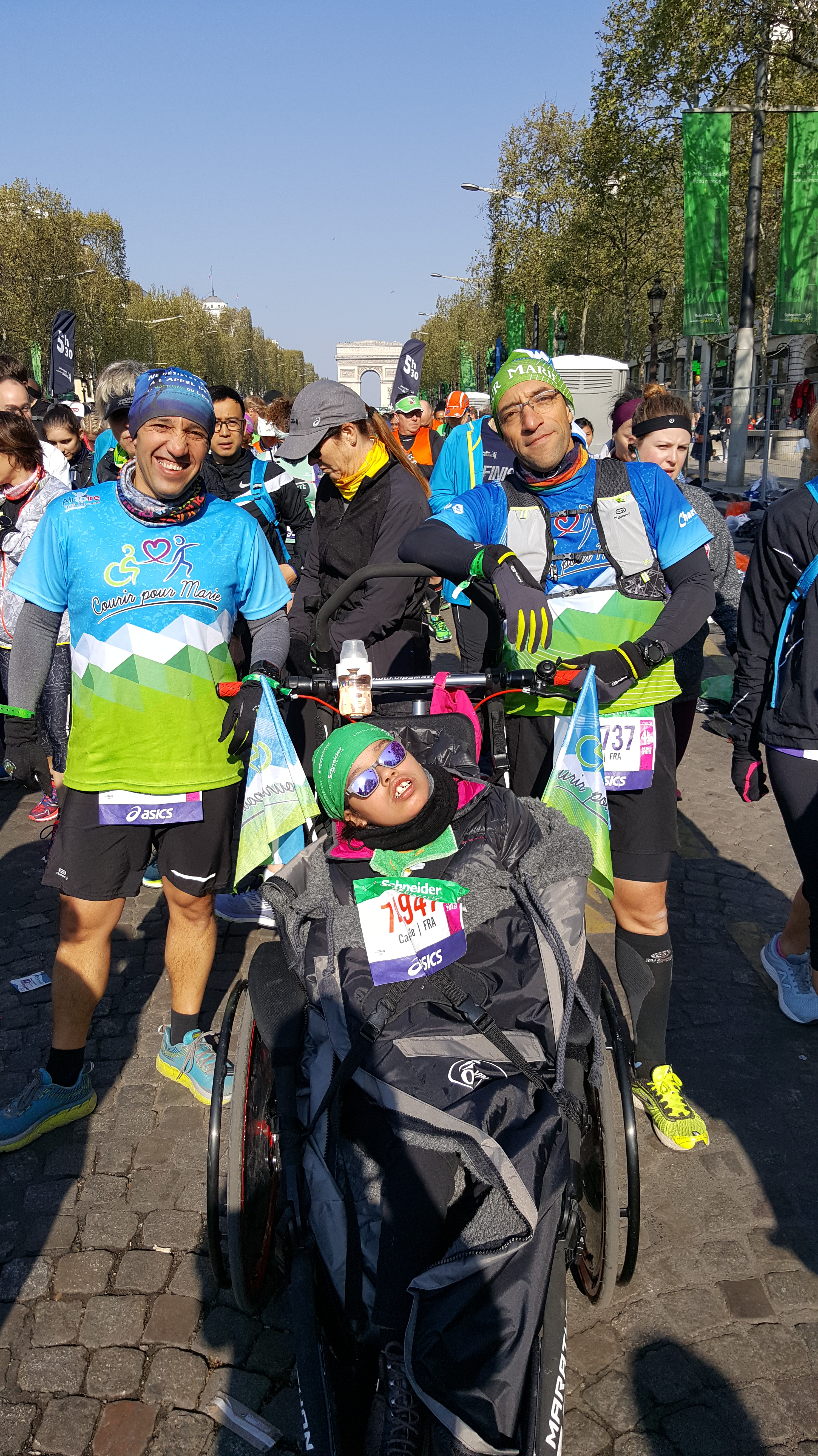 Nous voici donc repartis sur les 42km parisiens, mais ce coup ci, nous serons 8 coureurs à pousser 2 fauteuils, malheureusement, nous partirons séparément donc je n’ai de photos que d’une équipe. Mais ce qui compte est que nous sommes de plus en plus nombreux à nous élancer sur cette distance.
